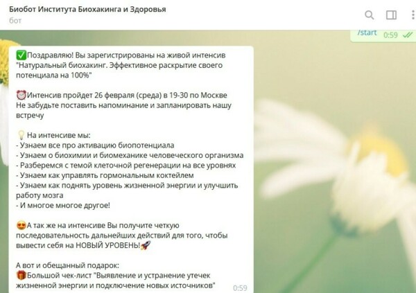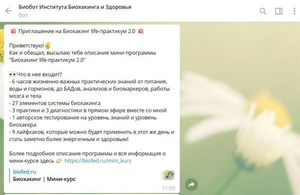 4. После этого звонка робот сам отправляет лид-магнит, который мы обещаем пользователю за регистрацию на вебе, личным сообщение в Telegram. И тем самым "парсит" его контакт в чат-бот.