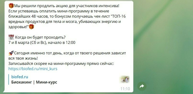 Пример прогревочного сообщения: