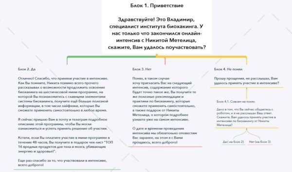 Ключевое преимущество робота перед живым менеджером — его способность делать множество касаний, и отрабатывать отказы и возражения, предлагая различные ценные акции и офферы, исходя из индивидуальной потребности клиента.