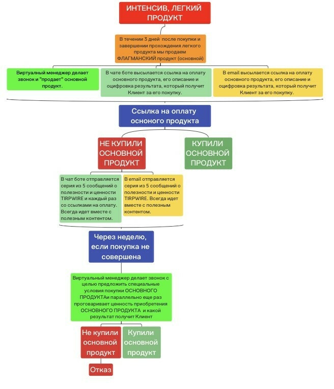 Этап 5. После прохождения легкого продукта (интенсив, практикум, мини-курс) закрываем Клиента на флагманский продукт. В случае, если этот продукт не был куплен сразу, также подогреваем Клиента в течение недели и далее прожимаем на оплату "флагмана".